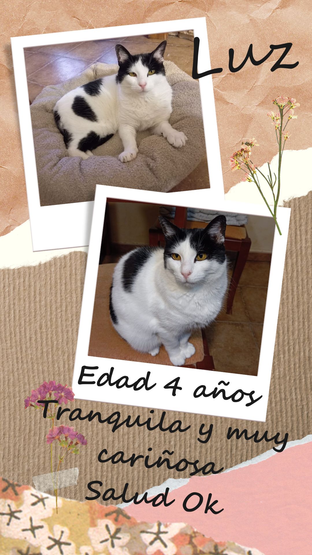 [vc_row css_animation="" row_type="row" use_row_as_full_screen_section="no" type="full_width" angled_section="no" text_align="left" background_image_as_pattern="without_pattern"][vc_column][vc_empty_space height="30px" image_repeat="no-repeat" background_image="9060"][/vc_column][/vc_row][vc_row css_animation="" row_type="row" use_row_as_full_screen_section="no" type="grid" angled_section="no" text_align="left" background_image_as_pattern="without_pattern"][vc_column width="1/2"][vc_gallery type="flexslider_slide" interval="3" images="10049,10050" img_size="600x734" css_animation="rotateInUpLeft"][/vc_column][vc_column width="1/2"][vc_column_text el_id="607"] Descripción: Luz es una gata súper cariñosa y tranquila, apareció junto con sus dos cachorritos abandonada por la calle y muy...